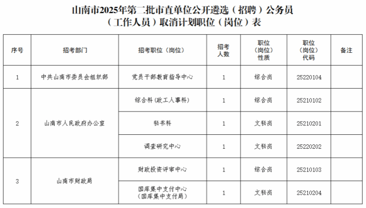 据“山南组工”消息,山南市2025年第二批市直单位公开遴选(招聘)公务员(工作人员)报名及资格审查已结束。按照《山南市2025年第二批市直单位公开遴选(招聘)公务员(工作人员)公告》要求,各职位(岗位)报考人数与遴选(招聘)计划的比例不得低于3:1,形不成有效竞争的职位(岗位)计划缩减,缩减后仍达不到开考比例的取消。经研究,决定取消未达到开考比例的遴选(招聘)计划,详情如下↓